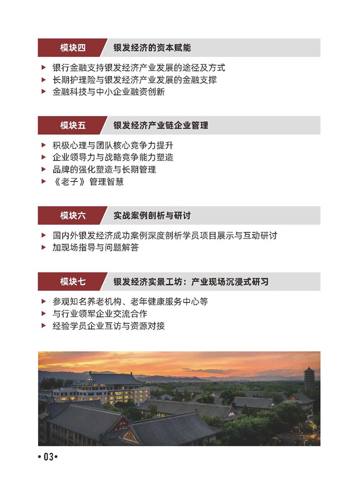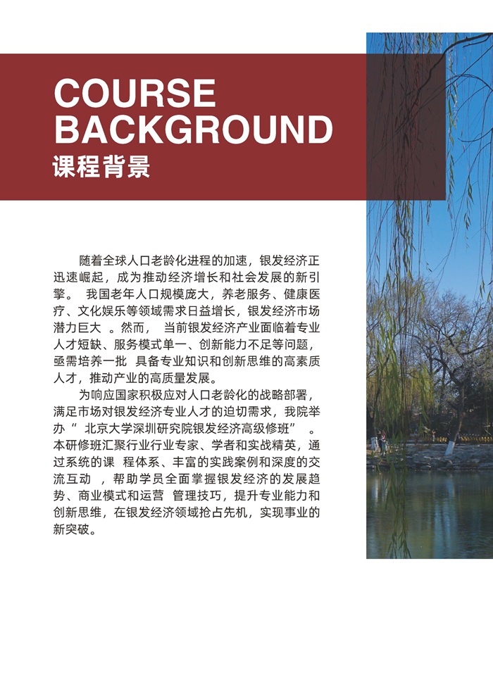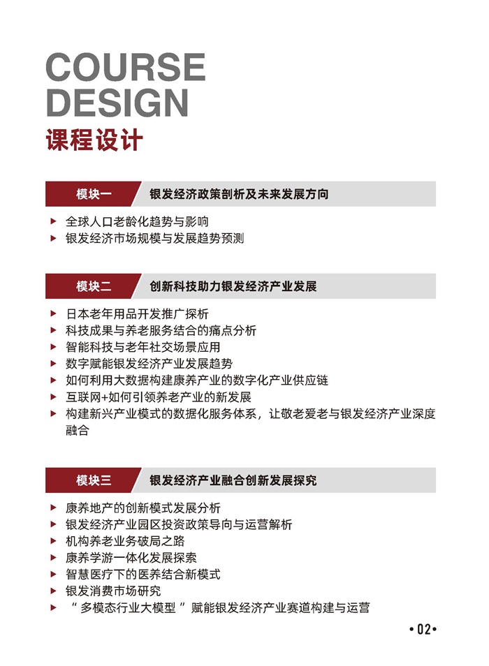 ”。本研修班汇聚行业行业专家、学者和实战精英,通过系统的课 程体系、丰富的实践案例和深度的交流互动 ,帮助学员全面掌握银发经济的发展趋势、商业模式和运营 管理技巧,提升专业能力和创新思维,在银发经济领域抢占先机,实现事业的新突破。
