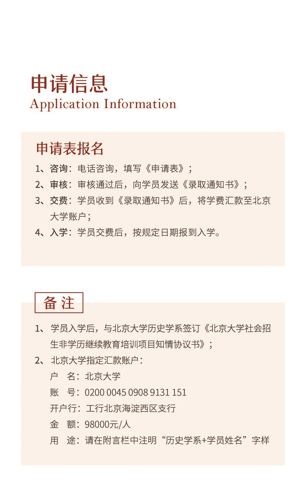 北京大学中国美学高级研修班报名热线:15010885562 【招生办公室】 联 系 人:张老师 赵老师 电 话:15010885562 邮 箱:2629379878@qq.com 联系地址:北京市海淀区北京大学校内
