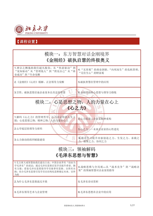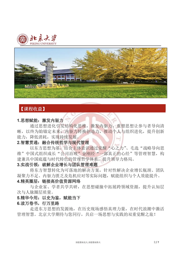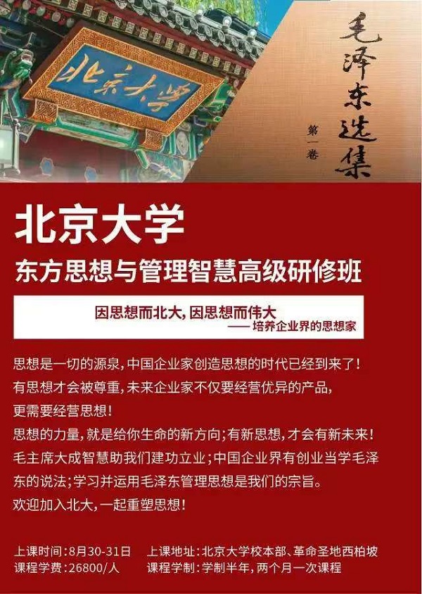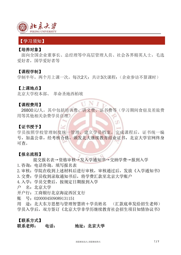 北京大学东方思想与管理智慧高级研修班报名网址:http://www.beida-peixuen.com 【招生办公室】 联 系 人:张老师 赵老师 电 话:15010885562 邮 箱:2629379878@qq.com 联系地址:北京市海淀区北京大学校内